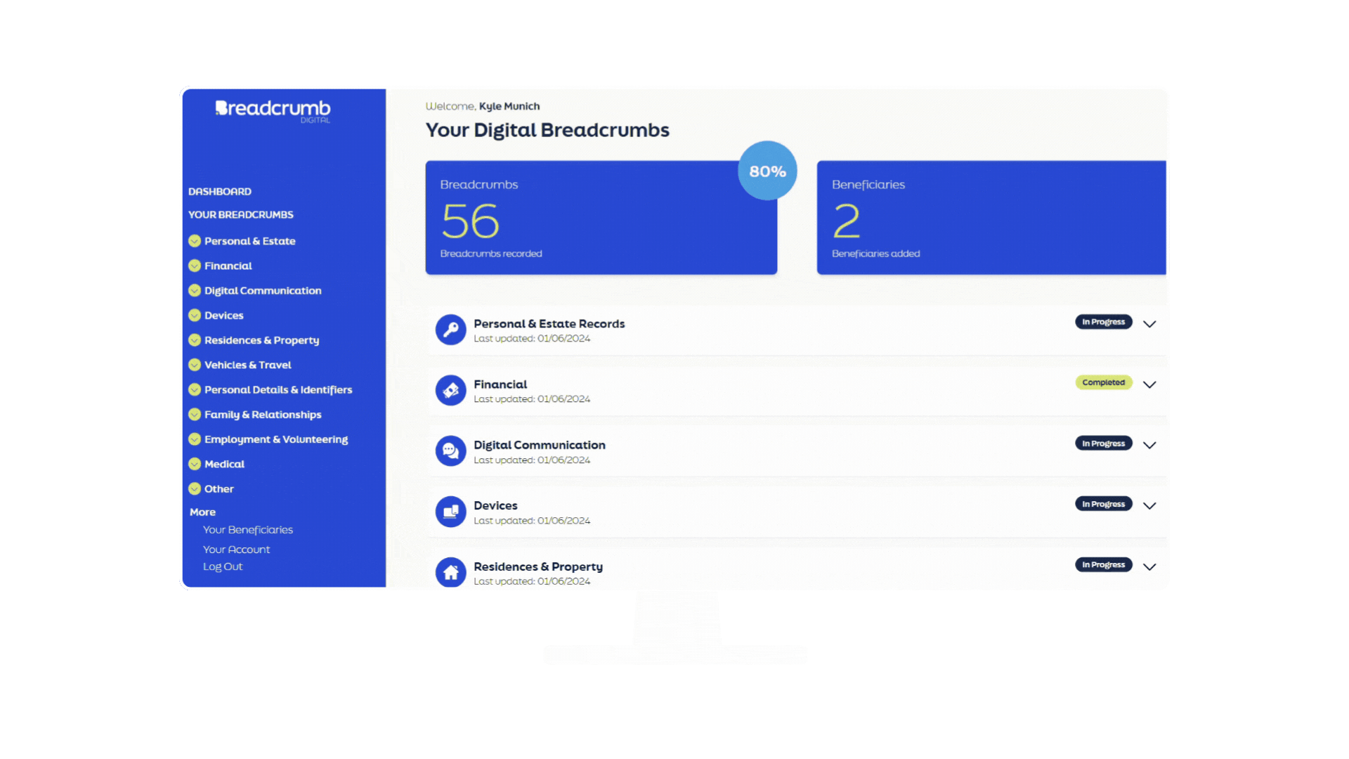 Our dashboard tracks what sections you’ve completed and where you still need to finish, ensuring you know exactly what you’re leaving behind for your loved ones.